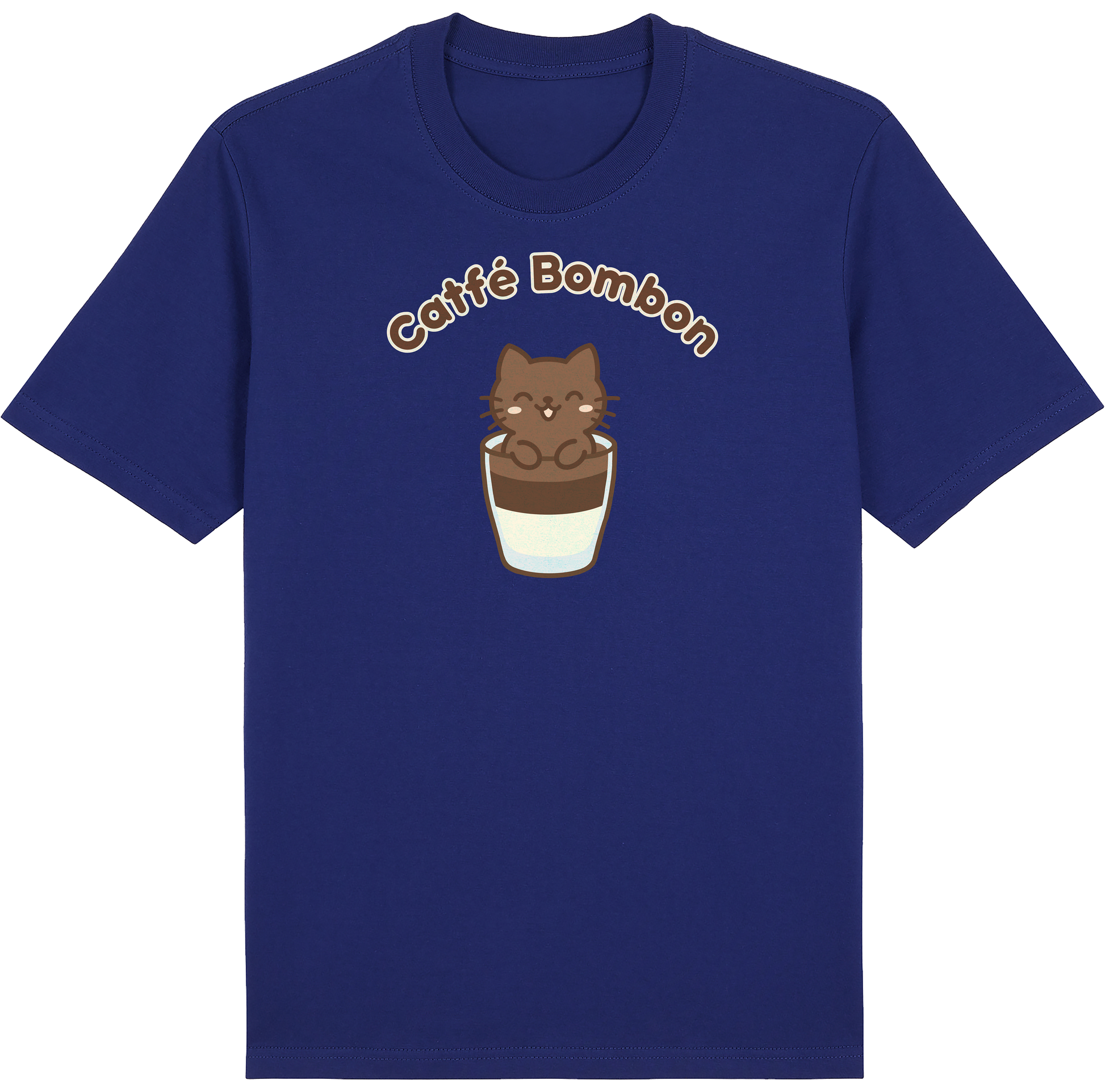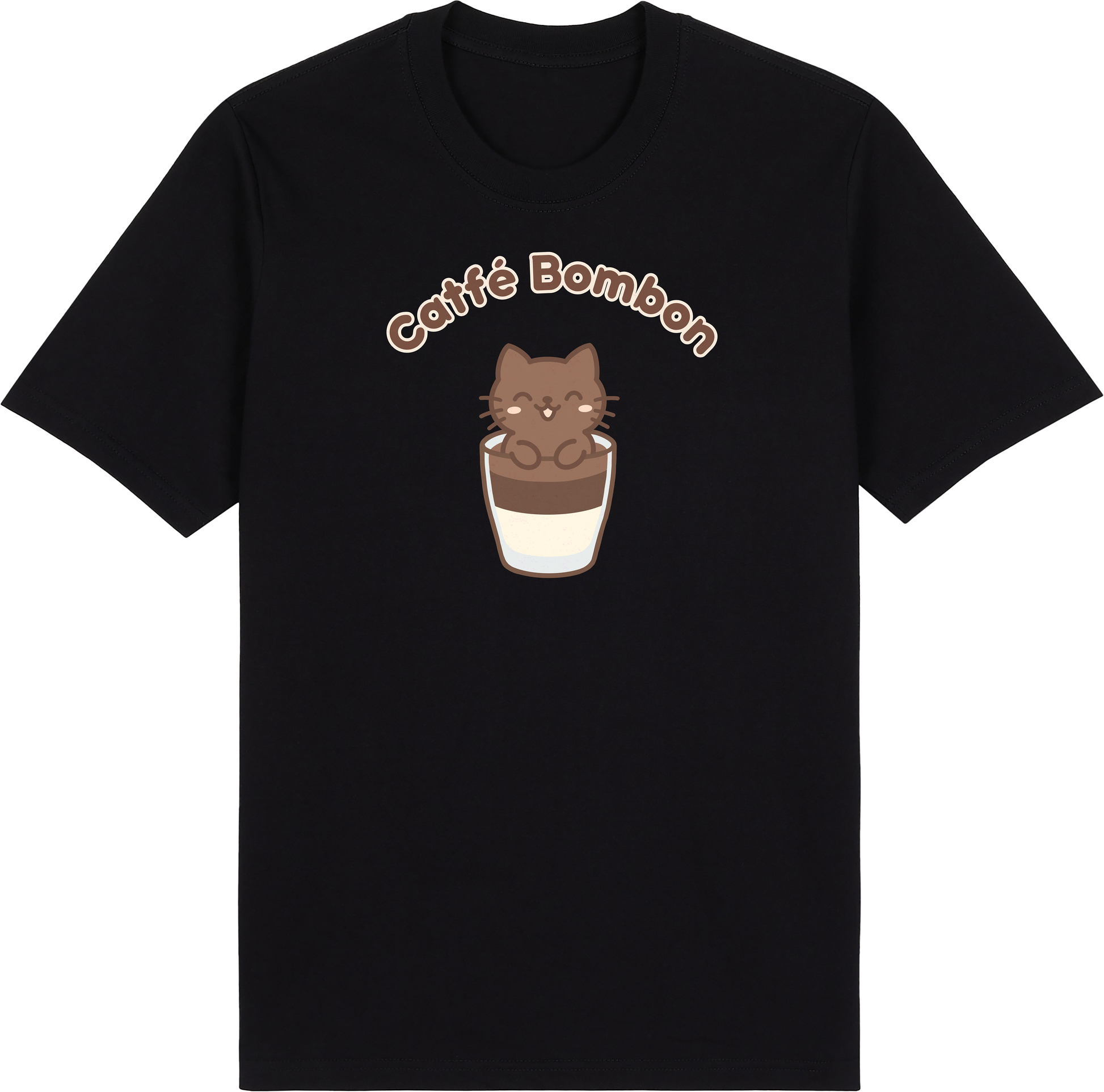 The Catfé Bombon Tee features a happy dark chocolate kitty sitting inside a beautifully layered glass of Spanish-style café bombón of rich espresso over sweet milk. Whether you're a coffee connoisseur or a lover of all things kawaii, this design serves up cozy coffee shop vibes with a delightful touch of cuteness.