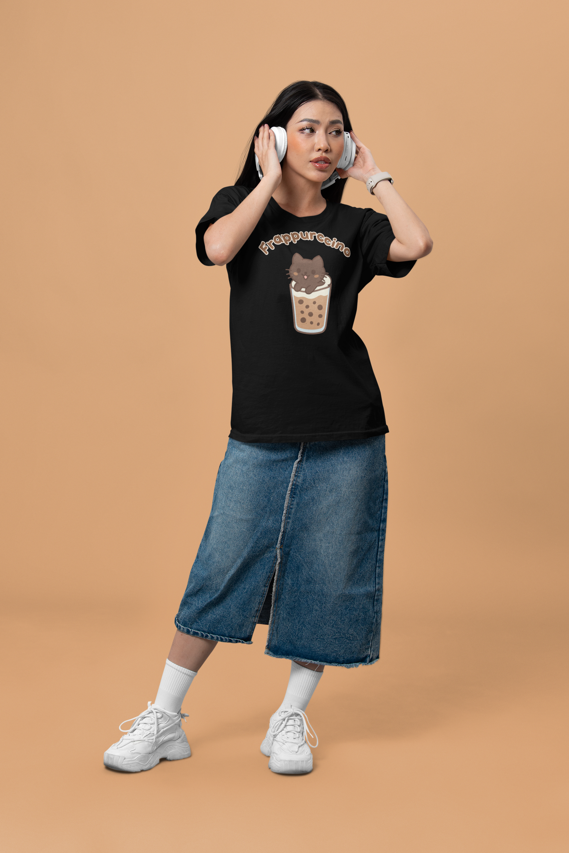 The Frappurccino Tee features an adorable dark kitty happily chilling inside a creamy frappuccino glass filled with chocolate chips - the ultimate treat for coffee lovers, dessert fans, and kawaii cat enthusiasts! Whether you're sipping your favorite drink or just vibing in cozy style, this tee brings sweet café energy wherever you go.